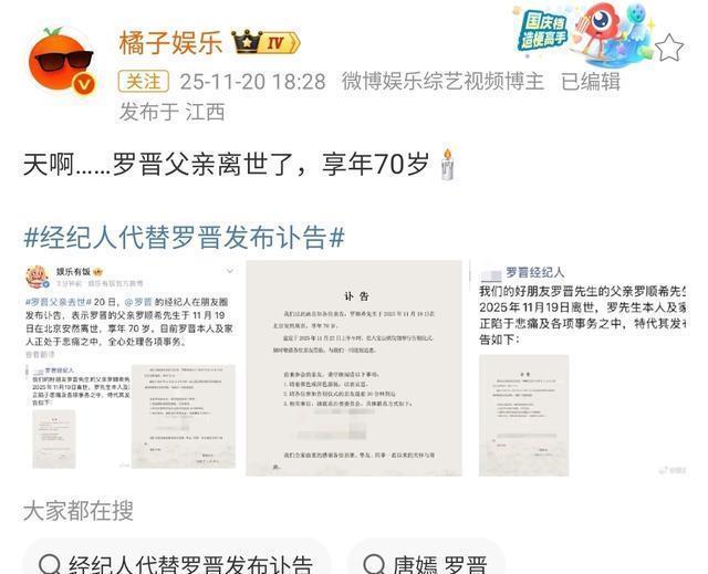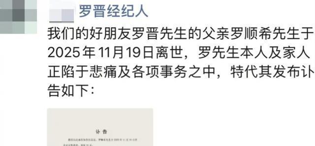 11月20日,娱乐圈再传噩耗,这一次,是沉痛的死别。 媒体“橘子娱乐”爆料,演员罗晋的经纪人于朋友圈代为发布讣告,对外证实罗晋的父亲不幸离世。