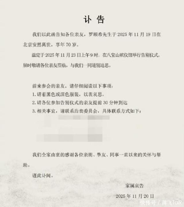 讣告内容不多,只是说了演员罗晋的父亲罗顺希11月19日在北京去世,享年70岁,告别仪式已经定在了23号,希望亲朋好友都能过来。