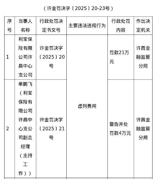针对上述违法违规行为,国家金融监督管理总局许昌监管分局对其罚款21万元;对利宝保险有限公司许昌中心支公司副总经理(主持工作)单鹏飞,警告并处罚款4万元。
