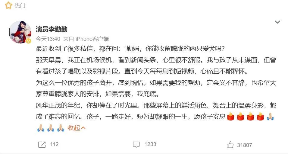 文中李勤勤这样写道:最近收到了很多私信,都在问,“勤妈,你能收留朦胧的两只爱犬吗?”那天早晨,我正在机场候机,看到新闻头条,心里很不舒服。我与孩子从未谋面,但曾有看过孩子唱歌以及影视片段。直到今天每每刷到短视频,心痛且不能释怀。